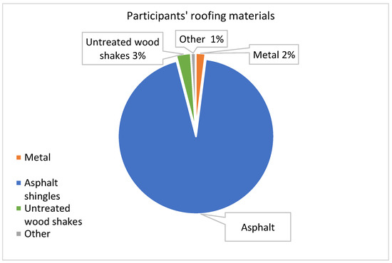 We found that an overwhelming majority of the participants have asphalt shingles (94%) and metal roofing (2%) (Figure 4). These are fire-rated roofing material known to offer strong protection to ember fire starts [7]). An earlier study by [11] similarly noted the use of asphalt shingles becoming common in new-house construction in Alberta. Only 3% of the participants reported having untreated wood shakes––a roofing material rated as flammable and more vulnerable to sparks and burning embers from a wildfire [43]. The remaining 1% had other materials such as recycled plastic, rubber, and treated wood shakes.