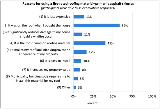 The majority (59%) of the participants stated they had asphalt shingles because it was on their roof when they bought their house, and it is the most common roofing material (41%). Some of the other reasons cited included aesthetic reasons or for improving the appearance of a property (17%), it being less expensive (13%), and easy to install (10%) (Figure 5). Only 11% of the participants stated they had asphalt shingles because the shingles could significantly reduce damage to their house should a wildfire occur.