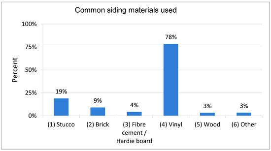 We found that the majority of the study participants had vinyl as a siding material (78%) (Figure 6). The use of vinyl siding can decrease the likelihood of a house surviving a wildfire as this material can melt when exposed to high temperatures, allowing the fire to reach the underlying wall components and penetrate the interior of the building (FireSmart Canada 2019). Only a third of the participants reported having siding materials with higher fire resistance including stucco (19%), brick (9%), and fiber cement, e.g., Hardie board (4%) (Figure 6). About 3% reported using wood and another 3% had other materials such as aluminum, metal, and cement.