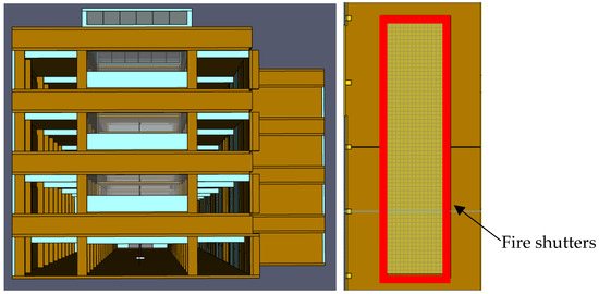This study takes the indoor pedestrian street of a children’s hospital in Fujian Province as the model, which has 4 floors and the height is 4.5 m per floor. The pedestrian street is 154 m long and 17 m wide. The width of the ring corridor is 4 m and the height under the ceiling is 2.8 m. The pedestrian street has three atriums, #1, #2 and #3, and the height of each atrium is 19.8 m (including the height of smoke storage bins). The #2 atrium is selected as the study object, which is 32.4 m long and 8 m wide. The fire shutters separate the ring corridor from the atrium, which is 7.3 m wide, 31.8 m long and 2.8 m high. During the experiments, the doors and windows on both sides of the ring corridor are closed. The volume of the smoke exhaust fan in this study is 64,200 m3/h as the actual experiment building is. The schematic diagram of the numerical model of the building complex is shown in Figure 1.