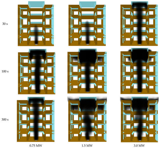 According to the principle of fire dynamics, fire development goes through three stages: accelerated combustion, stable combustion and extinction. Figure 3 shows the diagram of the smoke spread of fire inside the atrium at 30 s, 100 s and 300 s of the fire. Under the effect of thermal buoyancy, fire smoke rises first and spreads horizontally after reaching the ceiling. When the heat release rate is 0.75 MW, only a small amount of smoke is produced, and the height of smoke reaches half of the height of the atrium; after that, it begins to generate more smoke. At 100 s, the smoke reaches the ceiling and spreads into the ring corridor. At 300 s, the smoke has filled the upper space of the atrium. When the heat release rate reaches 1.5 MW, smoke is generated more obviously and quickly. The atrium above the fourth floor is almost filled with smoke at 100 s. When the heat release rate comes to 3.0 MW, smoke only takes 30 s to reach the ceiling, then it begins to spread outside through the window of the top floor at 100 s. Due to the restriction of the walls of the atrium, the continuously generated smoke begins to settle, and there is a clear boundary between the smoke layer and the cold air layer.