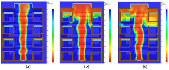 Diagram of the visibility inside the atrium at 30 s, 100 s and 300 s of the fire. (a) 30 s (b) 100 s (c) 300 s.