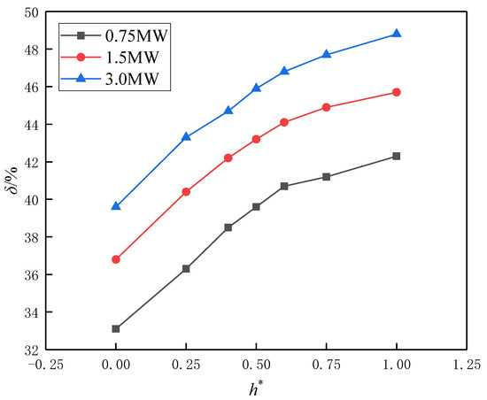 It can be seen from Figure 8 that the smoke extraction efficiency in the mechanical smoke exhaust mode shows a trend of increasing at first with the increase of smoke exhaust velocity and then stabilizing after reaching a critical number. When the smoke exhaust velocity increases to 8 m/s, the mechanical smoke extraction efficiency is basically unchanged, regardless of the heat release rate. Therefore, we only analyze the increase stage of smoke extraction efficiency and ignore the stability stage. The dimensionless heat release rate has no direct connection with dimensionless descending height h* and dimensionless smoke exhaust velocity v*. Therefore, it can be understood that is independent with h* and v*. For the heat release rate of 3.0 MW, the variation law of δ with h* and v* are shown in Figure 9 and Figure 10.