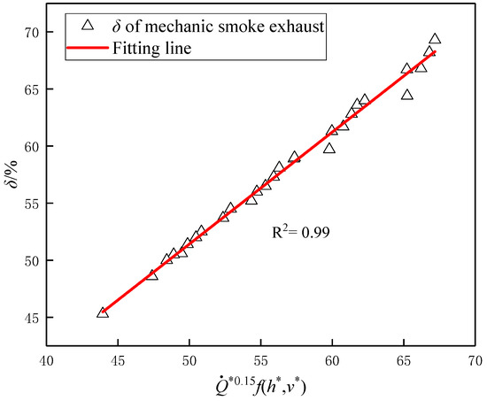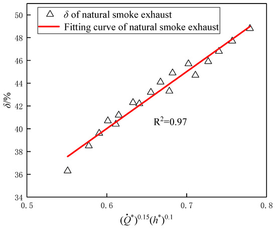 Furthermore, take the heat release rate into account, the relationship turns . The relationship between δ and at different descending heights is shown in Figure 11. The fitting results show that the theoretical formula matches the actual results and is reliable.