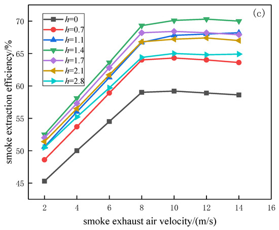 When the smoke exhaust system is turned on, the air entrainment is intensified and the smoke rises with the air, so that the smoke extraction efficiency is gradually improved. When the fire shutter drops to a critical height of about 1.4 m (half of the floor height), the effect of the descending height on the smoke extraction efficiency is small, because the small space at the bottom restricts the air entrainment. As we can see, under different heat release rates, the smoke extraction efficiency at the critical height is stable at 58%, 64%, and 70%, respectively, with an interval of 6%.