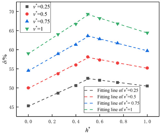 When h ≤ 1.4 m (h* ≤ 0.5), v* shows a positive correlation with δ. The relation expression can be ; when h ≥ 1.4 m (h* ≥ 0.5), v* shows a negative correlation with δ. The relation expression can be . Therefore, can be expressed as: