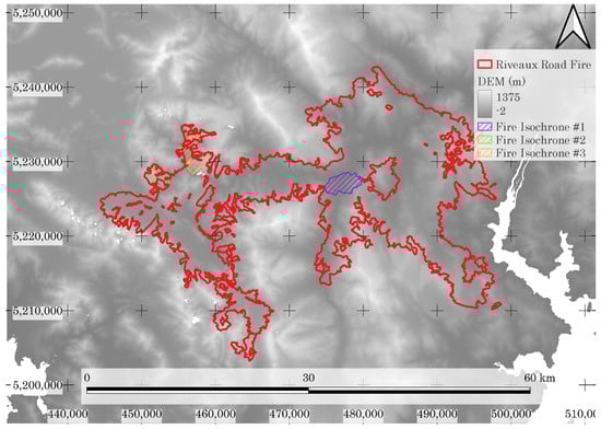 Extent of geospatial parameters for Riveaux Road Fire with three fire isochrones. Simulation was carried out over the entire domain represented in the image, beyond the observed fire boundary shown in red. Three fire isochrones were studied in this analysis: (#1) the east in purple occurred from the 18th in local time, (#2) the west isochrone in light green occurred from the 16th, and (#3) the north isochrone in orange started on the 20th.