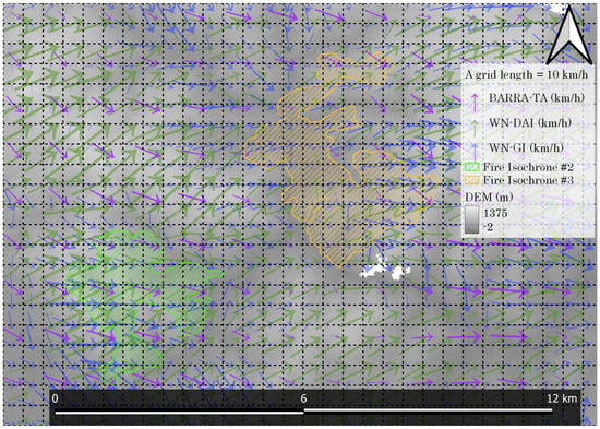 Wind type, which is ingested to simulate fire propagation, is configurable in Prototype 2. There were a few types of wind in this study, for example, the BARRA-TA at a resolution of approximately 1.5 km, and downscaled wind fields generated by WindNinja at approximately 637 m (WN-DAI) and 447 m (WN-GI) [43,44]. The details of the wind preprocessing are described in Section 2.3.2.