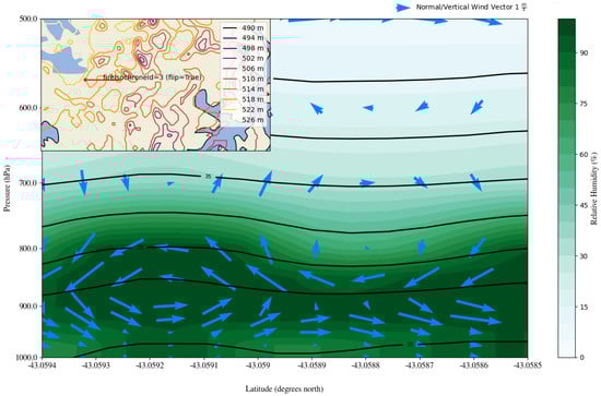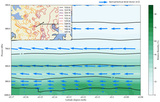 Example of cross section diagram for isochrone #3. Wind vectors are presented by blue arrow. The subfigure in the top-left pane shows the elevation contour for 950 hPa.