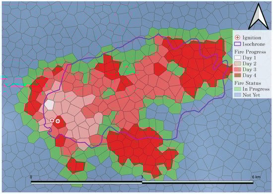The fourth limitation is the treatment of fire coalescence, which is not considered in this study due to the high computational requirement, and which prevented the incorporation of the acceleration of fire propagation coalescence [45]. Fire isochrone #1 contained two ignition points whose distance was approximately 160 m, but as the duration gap between these was approximately two days, coalescence effects appear unlikely.