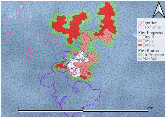 Example of fire simulation run for isochrone #2. White to red colored Voronoi grids show burnt areas, green Voronoi indicate the fire front in progress at the end of the simulation, while the observed isochrone is represented by the purple polygon. The fire ignited from a white cross icon in the middle of the figure.