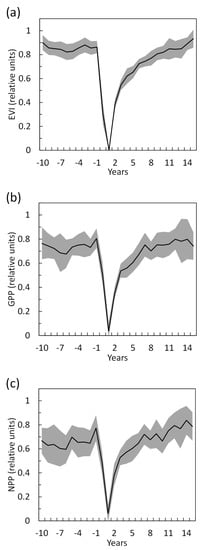 Vegetative recovery of burnt areas in the Siberian Arctic. The year of the fire is set at 0. (a) Enhanced vegetation index. (b) Gross primary productivity. (c) Net primary productivity. Shaded areas represent the 95% confidence interval around the trend line.