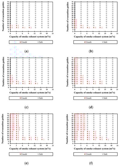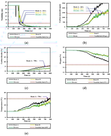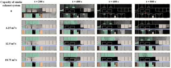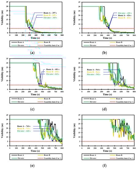 - The changes in the main factors (visibility, CO, CO2, and O2 contents, and temperature) according to the fire duration time () of a prototype nursing hospital were analyzed using the capacity of the smoke exhaust system as a variable. The analysis revealed that as the capacity of the smoke exhaust system increased, the time by which each factor exceeded the tenability criteria increased, and the ASET also increased. The most important factor determining ASET was the decrease in visibility due to the spread of smoke.