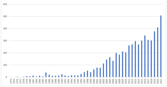 The Scopus search resulted in 5624 publications on fire management, with the first records dating from 1973; thus, the total period covers 49 years (Table 1). However, before the beginning of the 21st century, the number of publications was relatively low, with only 7.2% dating from 1973 to 1999 (see Figure 1). The yearly number of publications started to rise in the mid-1990s. Since then, there has been a steady increase. More than two-thirds (68.3%) of the documents are from 2010 to 2021. In 2003, more than 100 publications were identified. The year with the highest number of documents (507) was 2021. Most of the documents (82.8%) were research articles, followed by proceedings from scientific conferences (7.0%), revisions (5.9%), and book chapters (2.0%). The increase in fire-management publications has been slightly higher than the general growth of scientific publications. Comparing the years 2011 and 2021, for instance, the yearly number of publications on fire management increased by 48.9%, while scientific production in general, according to data from the SciVal platform of Scopus [38], increased by 45.7%.