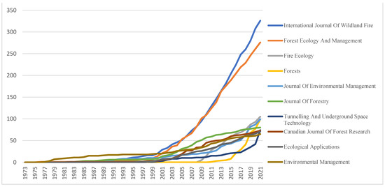Yearly number of publications of the 10 main sources on fire management indexed in Scopus (1973–2021).