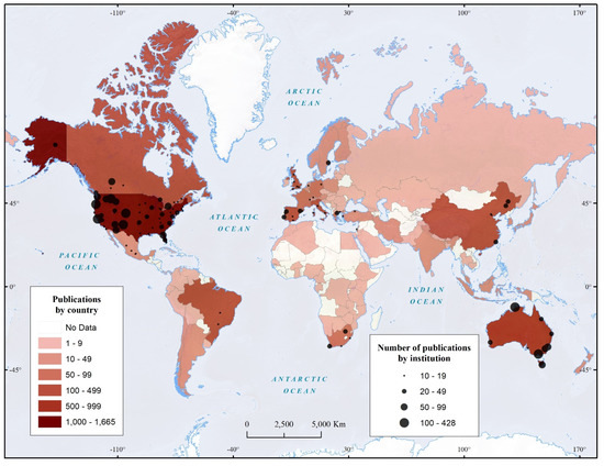 Most of the remaining institutes with 10 publications or more on fire management are also located in the US and Australia (Figure 3). In the former case, western states stand out, with 37 research institutes having published 2027 documents in this field. In the eastern states, the most productive institute is the University of Florida, with 61 publications. In Australia, apart from Charles Darwin University in the Northern Territory, most of the highly productive institutes are found in the country’s southeastern part.