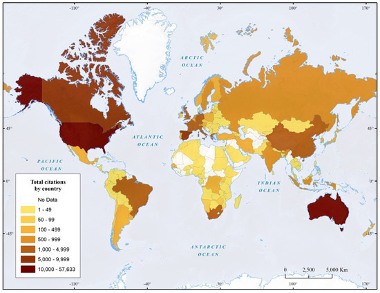 The US also has the most citations within the selected publications, with more than 57,000, that is, 35 per document (Figure 4). Australia ranks in second place with 20,664 citations and an average of 28 per document, followed by Canada (8696), Spain (6427), Portugal (3847), South Africa (3195), China (3002), the UK (2837), Italy (2268), and Brazil (1690). Interestingly, several countries with a low total number of publications present a high average of citations, led by Swaziland with an average of 55 (3 articles and 165 citations), Slovenia with an average of 48 (2 publications, 96 citations), and Switzerland with an average of 46.6 (25 publications, 1165 citations).