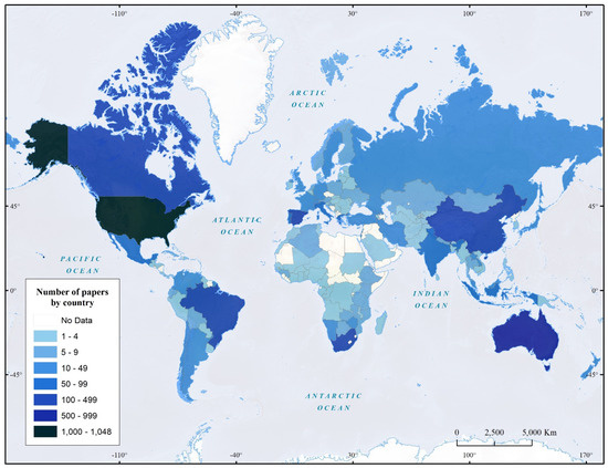 This kind of analysis consists of identifying variables within publications, which can be divided into the following categories of focus: personal, productivity, citation, content, and methodological [24,25]. Two types of analysis are used. The first relates to evaluation of performance based on scientific production metrics; the second focuses on bibliometric mapping. The end result is a visual representation of the publications’ dynamics and structure, from applying network-analysis techniques [23,26]. Through these techniques, it is possible to obtain parameters on the role of specific authors within a field and the relevance of countries, institutions, and journals [27,28]. Studies offering a particular perspective on the spatial characteristics of publications have gained ground in recent years [29,30,31]. This paper follows these novel approaches and further advances the graphic representation of the publications’ spatial foci, including the main study areas, integrating the data in a geographic-information system.