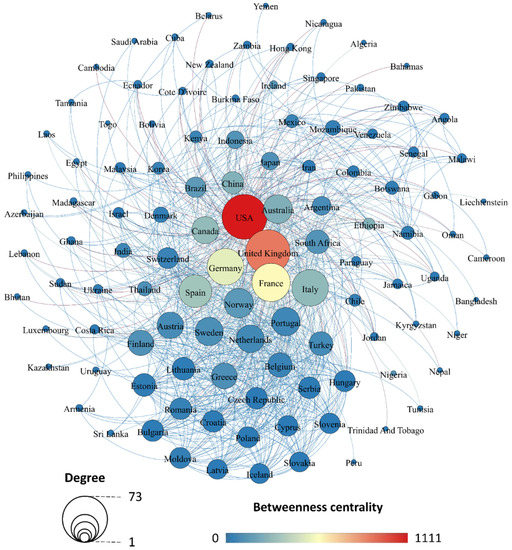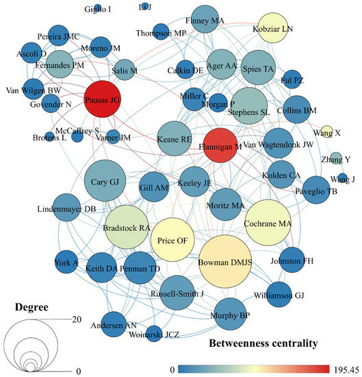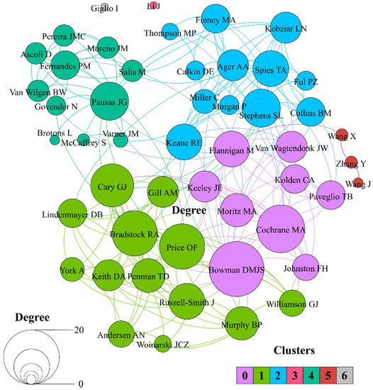 Several clusters of collaboration can be identified (Figure 8). Geography heavily influences the formation of these clusters. Authors in cluster 1 are entirely from Australia, those in cluster 2 are all from the USA, and those in cluster 5 are based in China, or are of Chinese origin. Clusters 0 and 4 group together authors from diverse countries, although there are also clear spatial orientations towards English-speaking countries (USA, Australia, Canada) in cluster 0 and mostly European countries in cluster 4. This does not mean that there are no connections between these clusters. Several authors stand out as connecting different groups of researchers, shown by their high betweenness centrality (Figure 7). The authors with the highest values in this regard are J.G. Pausas (195.45), M. Flannigan (178.50), D.M.J.S. Bowman (105.83), O.F. Price (99.57), and L.N. Kobziar (92.55). Figure 9 further shows the collaboration network between countries at the global level (for more detailed information see the Supplementary Materials, Table S6).