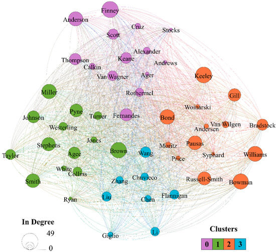 The co-citation network between the authors is naturally far more complex than the collaboration network. Just between the 50 authors identified by Bibliometrix as having a high number of co-citations, there are 1224 connections, resulting in an overall density of 0.5. The authors’ affiliation influences the clusters identified in Figure 10 less (detailed information in the Supplementary Materials, Table S7). They are, rather, oriented by other factors, such as their thematic focus.