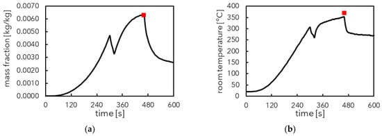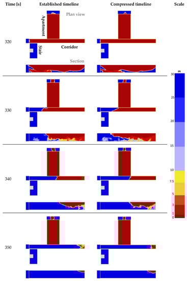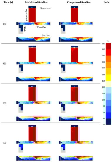 | 300 | Apartment door opens | After 300 s, the apartment door opens. SCA guidance [11] describes this time as “appropriate at the time the occupants of the fire apartment make their escape”. |