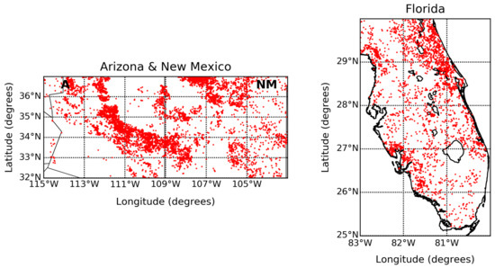 We used lightning data provided by the National Lightning Detection Network (NLDN) [41,42], which is operated by Vaisala over two different regions of the CONUS. In particular, we analyzed Cloud-to-Ground (CG) stroke data from Arizona and New Mexico (103 W–115 W longitude and 32 N–37 N latitude) and Florida (80 W–83 W longitude and 25 N–30 N latitude) between May and September 2009–2013. The NLDN is composed of 113 Very Low Frequency (VLF) sensors distributed over the CONUS that provide the position, time of occurrence, polarity, and peak current of lightning strokes. NLDN has a Detection Efficiency (DE) of about 90–95% for CG strokes and 18–34% for Intra-Cloud (IC) strokes over the CONUS [43]. In turn, the median location error of NLDN before 2013 was 198 m [44]. The DE of NLDN over CONUS can be considered high and suitable for the present study, as the DE of the World Wide Lightning Location Network (WWLLN) in the investigated area during 2009 and 2012 ranged between 5% and 15% [45].