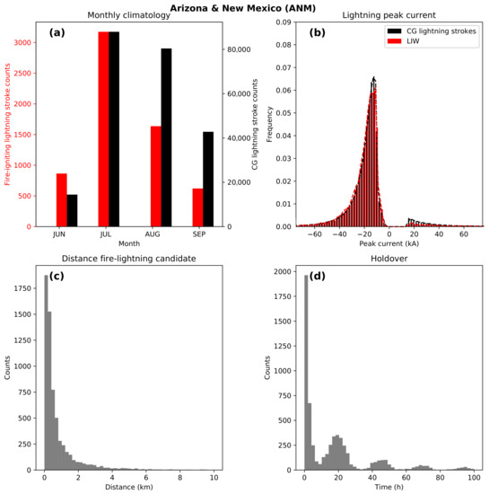 Figure 2. LIW in Arizona and New Mexico between 2009 and 2013: (a) Monthly distribution of the occurrence of total LIW and CG strokes over ponderosa pine and pinyon-juniper woodlands. (b) Frequency distribution of the peak currents of all CG strokes taking place over ponderosa and pinyon-juniper woodland forests in June and September (black) and of all fire-igniting lightning flashes (red) detected with NLDN. (c) Distribution of the distance between the reported position of ignition and the lightning candidate. (d) Distribution of the holdover.