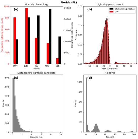 Figure 3. LIW in Florida between 2009 and 2013: (a) Monthly distribution of the occurrence of total LIW and CG strokes over slash pine and baldcypress. (b) Frequency distribution of the peak currents of all CG strokes taking place over slash pine and baldcypress forests in June and September (black) and of all fire-igniting lightning flashes (red) detected with NLDN. (c) Distribution of the distance between the reported position of ignition and the lightning candidate. (d) Distribution of the holdover.