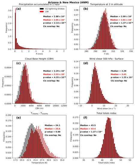 Figure 4. Frequency distribution of hourly accumulated precipitation (a), air temperature at 2 m altitude (b), CBH value (c), wind shear between the pressure level of 500 hPa and the surface (d), temperature difference between the 700 hPa and 450 hPa pressure levels (e), and Total Totals Index (f) for CG lightning strokes (black) and LIW (red) over ponderosa and pinyon-juniper woodland forests in Arizona and New Mexico during the fire season between 2009 and 2013. The p-values were obtained from the Kruskal–Wallis H-tests [59]. The analysis results for the overlap of the 95% bootstrap CI of the medians are included.