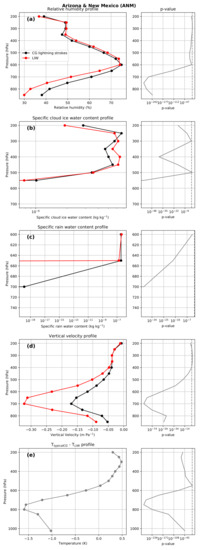 Figure 5. Vertical profiles of the most important meteorological conditions for LIW (red) and typical CG (black) in Arizona and New Mexico. The first column shows the vertical profiles of the median relative humidity (a), specific cloud ice water content (b), specific rain water content (c), vertical velocity (d), and temperature difference (e) for the CG stroke and LIW climatologies during the fire season in Arizona and New Mexico between 2009 and 2013. The second column shows the p-value (solid line) for each vertical level, which represents the probability of equal medians between both distributions (the dashed line shows the significance limit at 0.05). The p-values were obtained from the Kruskal–Wallis H-tests [59].