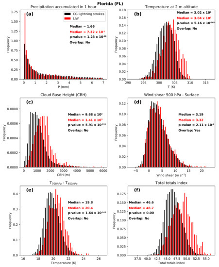 Figure 6. Frequency distribution of hourly accumulated precipitation (a), air temperature at an altitude of 2 m (b), CBH value (c), wind shear between the 500 hPa pressure level and the surface (d), temperature difference between the 700 hPa and 450 hPa pressure levels (e), and the Total Totals Index (f) for CG lightning strokes (black) and LIW (red) over the ponderosa and pinyon-juniper woodland forests in Florida during the fire season between 2009 and 2013. The p-values were obtained from the Kruskal–Wallis H-tests [59]. The analysis results of the overlap of the 95% bootstrap CI of the medians.
