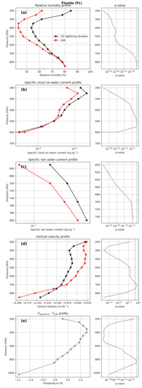 Figure 7. Vertical profiles of the most important meteorological conditions for LIW (red) and typical CG (black) in Florida.The first column shows the vertical profiles of the median relative humidity (a), specific cloud ice water content (b), specific rain water content (c), vertical velocity (d), and temperature difference (e) for the CG stroke and LIW climatologies during the fire season in Florida between 2009 and 2013. The second column shows the p-value (solid line) for each vertical level, representing the probability of equal medians for both distributions (the dashed line shows the significance limit at 0.05). The p-values were obtained from the Kruskal–Wallis H-tests [59].