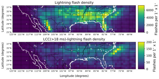 Following the method developed by [51], we identified all the LCC (>18 ms) lightning flashes detected by TRMM-LIS over the CONUS and Northern Mexico during the fire season between 1998 and 2014 (Figure 8). The maximum lightning activity takes place over land, while the occurrence of LCC (>18 ms) lightning reaches its maximum over the ocean, which is in agreement with [51].