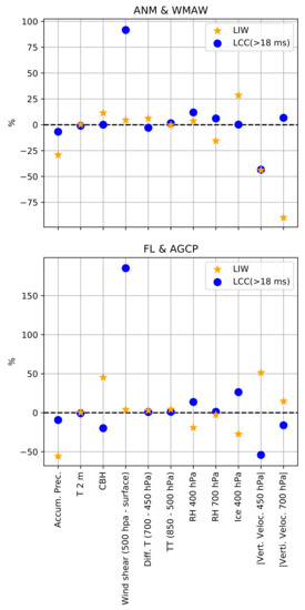 We compared the relationships between thunderstorms producing LIW and a high rate of LCC (>18 ms) lightning. The value distribution and the median vertical profiles of some meteorological parameters during the occurrence of typical and LCC (>18 ms) lightning flashes over WMAW and AGCP regions are shown in the Supplementary Materials (Figures S1–S4). Figure 9 shows the percent of variation in the medians of several meteorological variables for LIW and LCC (>18 ms) lightning produced by thunderstorms with respect to the climatology.