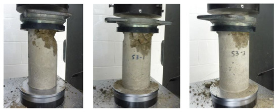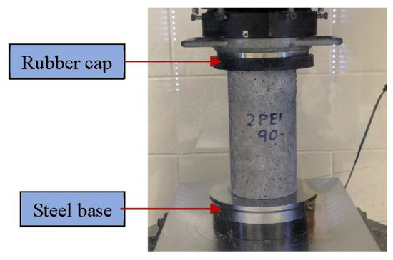 Compressive strength tests of 100 mm diameter cylinders were conducted according to AS 1012.9-2014 [28], ASTM C39/C39M-18 [29], and ASTM C617/C617M-15 [30]. After 28 days of curing, the compressive strength was determined using the universal testing machine by applying a force at a rate of 0.3 N/mm2/s until failure (Figure 8). The compressive strength of moist cured specimens was measured soon after their removal from the moist storage. The compressive strength of the specimens was calculated by dividing the maximum force applied to the specimen by the cross-sectional area. Further, the unconfined compressive strength was calculated by multiplying the experimental compressive strength from the aspect ratio of 0.78 in AS/NZS 4456.4-2003 [31].
