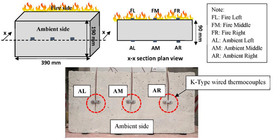 The block specimens were air dried for at least one week after moist curing prior to any fire resistance tests. Among the air dried blocks, the block specimens for the BAL-FZ test were conditioned again inside a controlled environment (i.e., at a temperature of 25 ± 2 °C and relative humidity of 45 ± 5%) for at least one week prior to the fire test. Prior to the fire test, the moisture content was within the range of 10–20% for the C-PE blocks and around 5% for the C-S blocks.