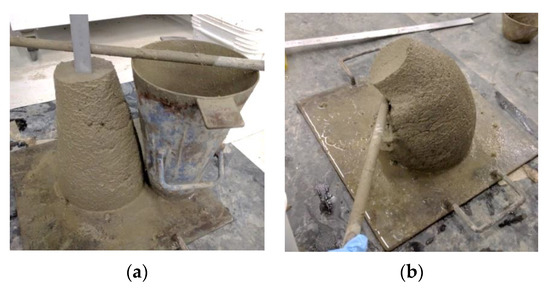 Slump test of the C-S mix: (a) shape of the slump and (b) gradual movement of the mix.