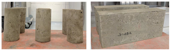 After the mixing procedure, the test specimens (see Table 3 and Figure 7) were cast within the next 20 min. All the specimens were covered to prevent loss of moisture and kept on a rigid horizontal surface for a period of 18–36 h at a temperature of 23 ± 2 °C. After the initial curing, they were de-moulded and kept under the standard moist curing conditions by storing them in lime saturated water at a temperature of 23 ± 2 °C until 28 days.