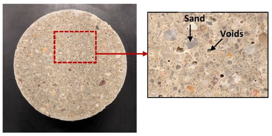 The fresh and hardened properties of the standard mix are provided in Table 4. As shown in Figure 11, slump testing (35 mm) confirmed the better workability of the mix from the gradual movement of the cement slump cone with tapping of the side. Therefore, the cast specimens had smooth surfaces without any aggregate bulges, and cracks and sand particles were distributed uniformly across the section (Figure 12 and Figure 13).