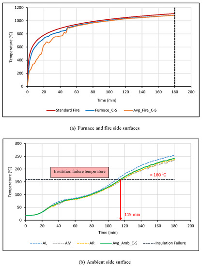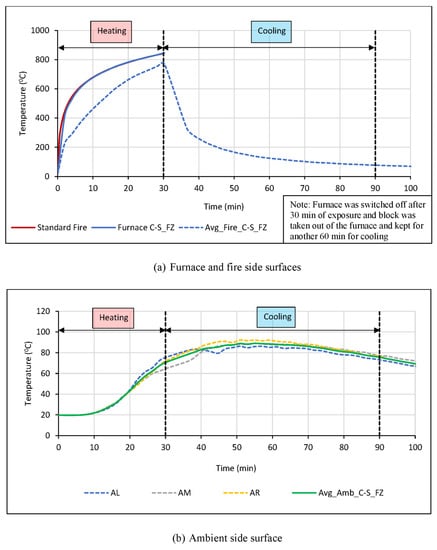 Figure 16 and Table 5 show the time–temperature curves of the fire and ambient side surfaces of C-S blocks from the bushfire test and a summary of the bushfire test results, respectively. The initial ambient surface temperature was 20 °C. At the end of the heating phase (i.e., after 30 min), the average temperature on the fire and ambient side surfaces were 773 and 71 °C, respectively. Then, the temperature on the fire side surface started to decrease while the temperature on the ambient side surface started to increase. A maximum ambient surface temperature of 89 °C was recorded during the cooling phase at 55 min, after which the ambient surface temperature started to decrease as well. At the end of 90 min of testing, the average ambient side surface temperature was 76 °C.
