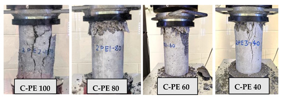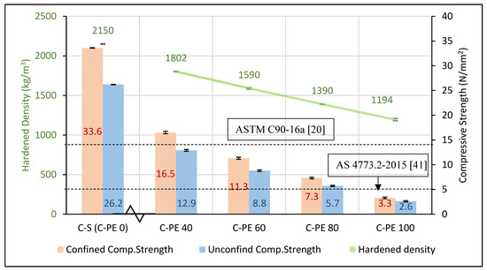 As mentioned in the previous section, ASTM C90-16a [20] specifies the compressive strength requirement for lightweight load-bearing concrete masonry units as 13.8 N/mm2. Therefore, only the C-PE 40 blocks can be categorized as lightweight load-bearing concrete masonry units. However, AS 4773.2-2015 [41] specifies that the minimum unconfined compressive strength for solid load-bearing and non-load-bearing units as 5 and 3 N/mm2, respectively. According to this requirement, all the developed lightweight cement mixes satisfy the load-bearing strength requirement, while the C-PE 100 mix only marginally satisfies the non-load-bearing strength requirement.