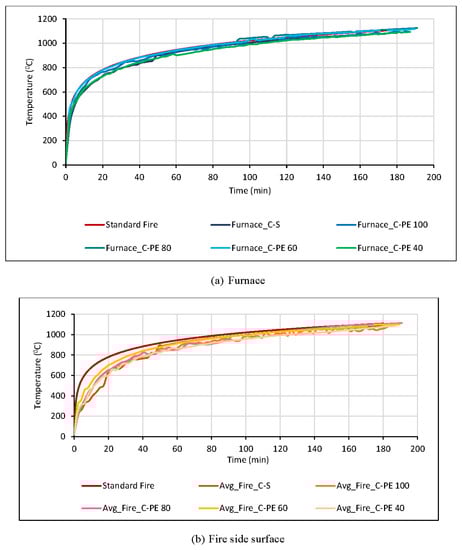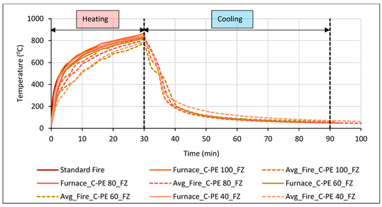 Both bushfire and building fire resistance tests were conducted for C-S and C-PE blocks. The bushfire resistance of blocks was measured by exposing a block to the standard fire curve for 30 min and then allowing it to cool down naturally for the next 60 min, simulating the bushfire attack level flame zone (BAL-FZ) test condition in AS 1530.8.2-2018 [36]. Building fire resistance levels of blocks were obtained based on AS 1530.4-2014 [37] by exposing them to the standard fire curve for three hours under non-load-bearing conditions.