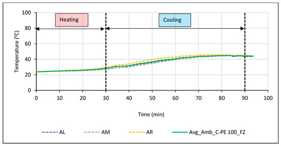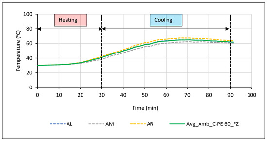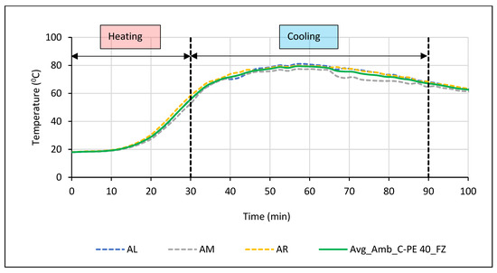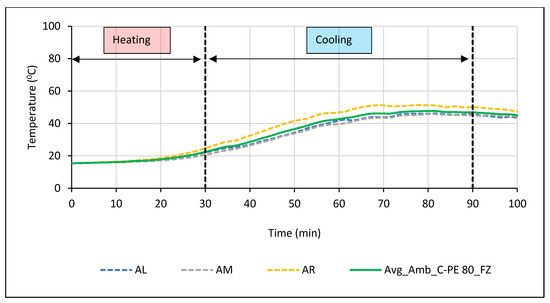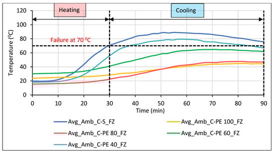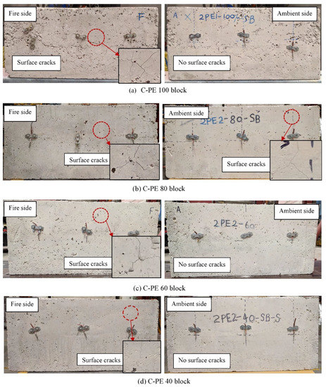 According to the Australian Building Codes Board (ABCB) performance standard, the maximum temperature limit for the interior surfaces of bushfire shelters is 70 °C [43]. As the maximum ambient surface temperatures of the C-S and C-PE 40 blocks were 89 and 79 °C, respectively, only the C-PE 100, 80, and 60 blocks are suitable for use in the external walls of bushfire shelters. Although the C-PE 100 block had the lowest temperature, the crack intensity level on the fire side of the C-PE 100 block was much higher than that of the C-PE 80 and 60 blocks (Figure 28). Although the C-PE 80 block recorded lower ambient surface temperatures compared to the C-PE 60 block, few ambient surface hairline cracks were observed on the C-PE 80 block after fire exposure (Figure 28), which might be due to improper bonding of materials due to less sand. Hence, considering both the bushfire shelters’ interior surface temperature limit and the crack intensity on the fire and ambient sides of the blocks, the C-PE 60 block appears to be the most suitable for the external walls of bushfire shelters.