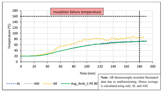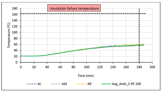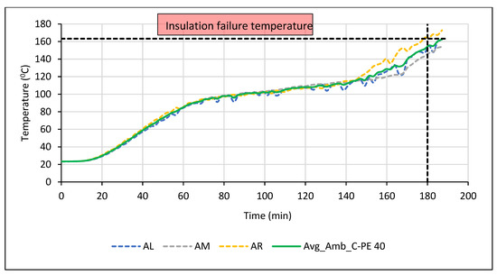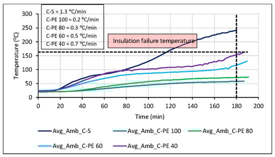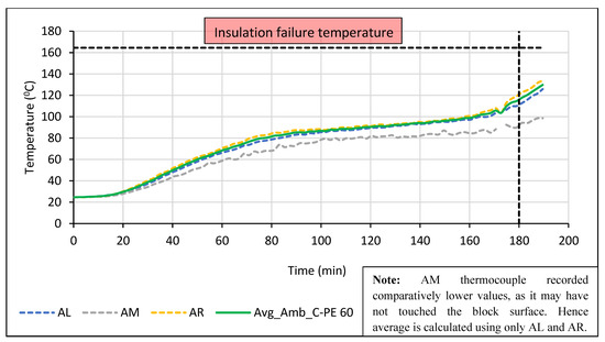Figure 38 shows the ambient side block surface time–temperature curves from the building fire tests of all the block units. According to Figure 38, the highest temperature was recorded by the C-S block, and consequent insulation failure was experienced after 115 min of fire exposure. However, none of the perlite blocks failed under the insulation and integrity criteria during three hours of fire exposure. Among the lightweight masonry blocks, the lowest ambient side surface temperature was recorded by the C-PE 100 block. The average temperatures recorded by C-PE 100, 80, 60, and 40 blocks after three hours of fire exposure were 57, 72, 118, and 156 °C, respectively (Table 6). Hence, similar to the bushfire resistance test, building fire resistance improved with increasing perlite aggregate content in the mix. The C-PE 40 block recorded the highest ambient surface temperature at the end of three hours (156 °C), and hence was closer to insulation failure (around 160 °C). In addition, the rate of the ambient surface temperature increment of the C-S block can be approximately calculated as 1.3 °C/min based on the trend line drawn between the initial and final temperature points at the end of three hours. Similarly, the C-PE 100, 80, 60, and 40 blocks recorded 0.2, 0.3, 0.5, and 0.7 °C/min, respectively. The rate of the ambient surface temperature increment was considerably higher in the standard cement–sand block than in the lightweight blocks, with the C-PE 100 block having a rate 85% lower than the standard block.