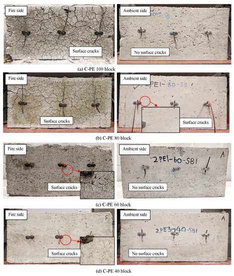 Figure 15 shows the surface of a block during and after fire exposure. After 15 min of heating, moisture patches appeared on the ambient side surface and then disappeared at the end of the heating phase. After 90 min of testing, cracks were observed on all sides of the block except on the ambient surface. Most of the cracks were generated from the fire-exposed surface to the ambient side, and crack intensity was higher on the fire-exposed surface. Discoloration of the block was noticed on the top, bottom, and side surfaces. However, no gaps or openings to the ambient side of the block were formed from fire, with no flaming observed on either side of the block during the test.