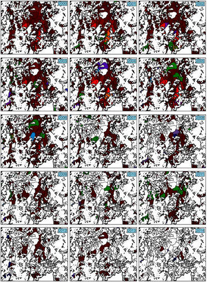 It shows the temporal evolution, during the period 2000–2014, of the ConForest_RGB chromatic coding. It has been chosen to show only a small region of the southwest sector to increase the visibility of the coding.