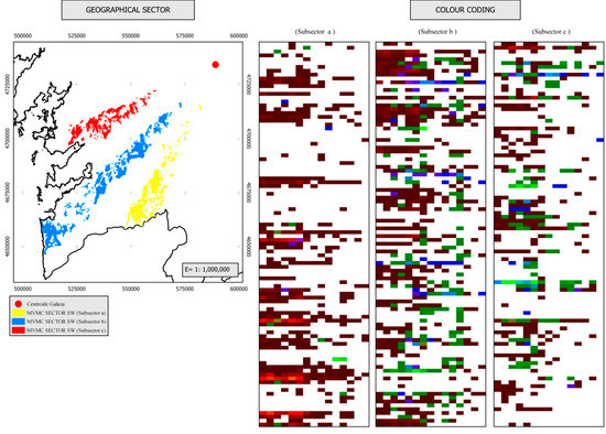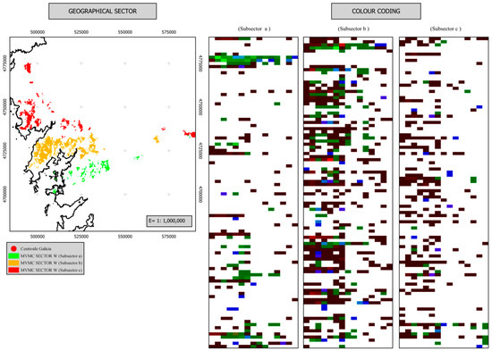 Given the large number of rows that make up the chromatic coding of some geographical sectors (in the SW sector, for example, there are 656 MVMCs, so the coding has the same number of rows) it is not possible to include the final result of the chromatic coding in a single representation. Therefore, we have chosen to show only the individual results of two geographical sectors (Figure 8 and Figure 9). One additional aspect should also be noted. In the sectors depicted in Figure 8 and Figure 9, there are a large number of MVMCs. Therefore, we decided to include in these chromatic codings only 300 MCVMs (45.73% of the existing MVMCs in the southwest sector, and 75.76% of the existing MVMCs in the West sector), divided into three columns of 100 MVMCs each. The first column includes the 100 MVMCs that occupy the first positions in the geographical sector, according to their azimuth. The second column corresponds to the central part of the geographical sector, and the third column includes the last 100 MVMCs of the geographical sector.