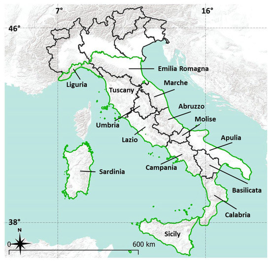 The analysis covers 209,198 km2, 69% of the Italian land surface, extending between 44° and 37° N and 8° to 17° E, from Liguria to Calabria and including the two largest islands (Sicily and Sardinia) (Figure 1). In this area, wildfires occur mainly in the summer months, unlike in the Alpine regions. In the past few decades, socio-economic changes have caused a diffuse abandonment of rural activities and settlements in inland areas and new forests have naturally and extensively expanded in agro-pastoral lands, reducing the landscape heterogeneity and increasing fire risk [13].