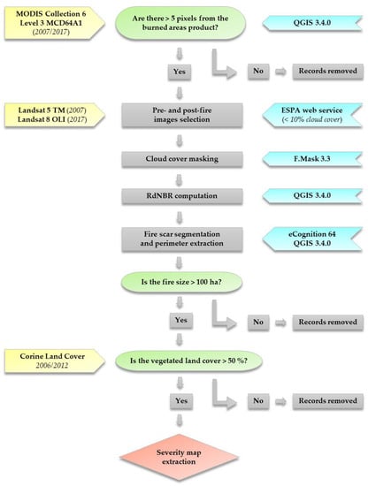 Flowchart of the standardized procedure for wildfire selection, perimeter extraction and burn severity assessment: input data sources (yellow), filtering procedure (green), software used (blue) and output map (pink).