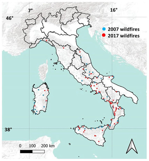 Since many ecosystems worldwide are experiencing fire regime shifts in response to changes in climate, land use and land cover [3,5,74,75], investigations into the increasing frequency, size and severity of wildfires are becoming necessary for adopting appropriate management practices. In this work, we analyzed two target years (2007 and 2017), providing a large fire sample size for our investigation. The mean size of all the Italian fires is much lower compared to that of the fires selected, probably due to the increasing effort committed to fire suppression [76]. We considered only large wildfires since their occurrence, expansion and severity are more likely to be influenced by climatic conditions [11]. Moreover, they are expected to increase in the future given climate and land use change trends [11]. A large accumulation of fuels and the increasing fire intensity can easily drive wildfires out of control [11].